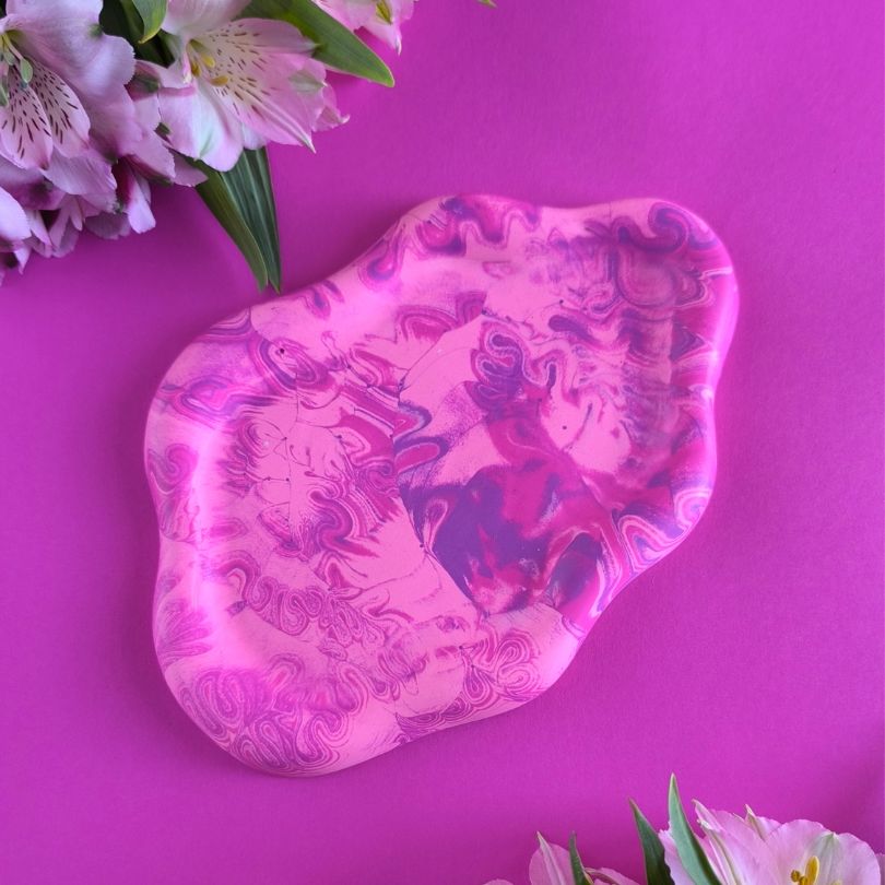 Różowa, marmurowa podstawka na bibeloty w nieregularnym kształcie wykonana ręcznie z ekologicznego gipsu polimerowego.